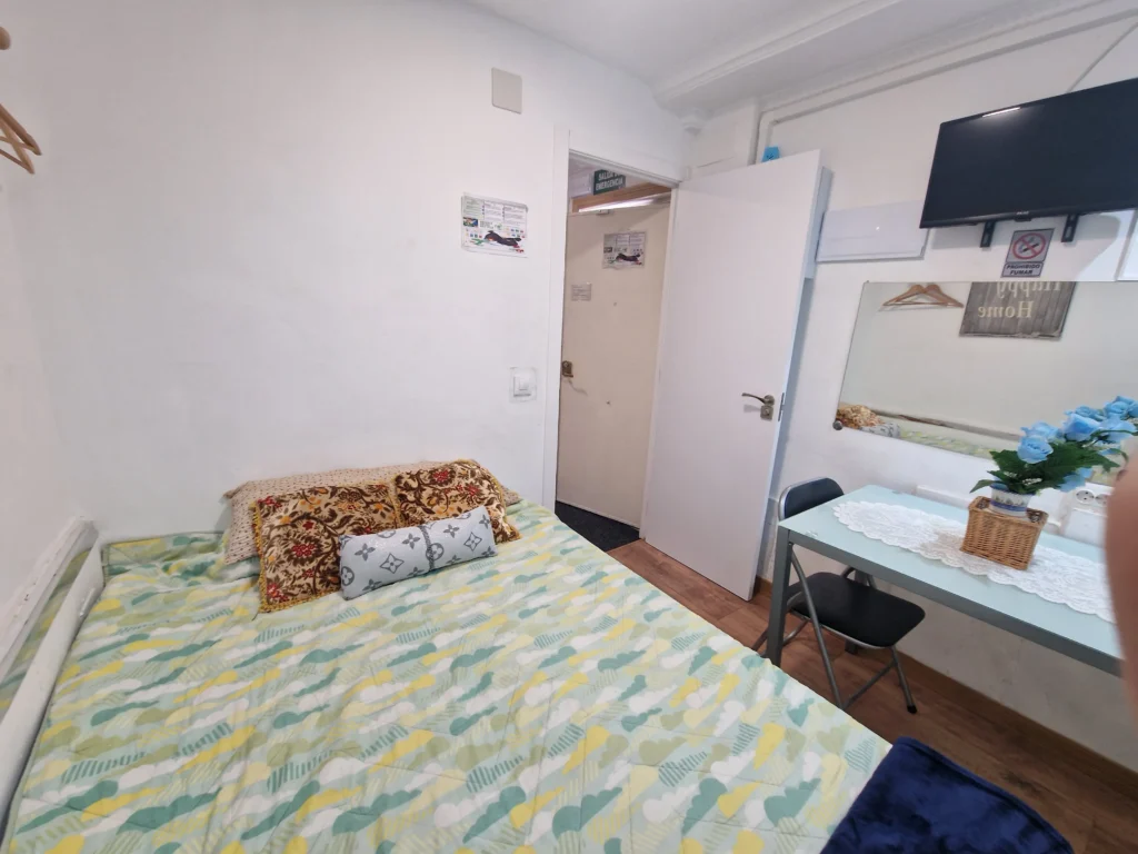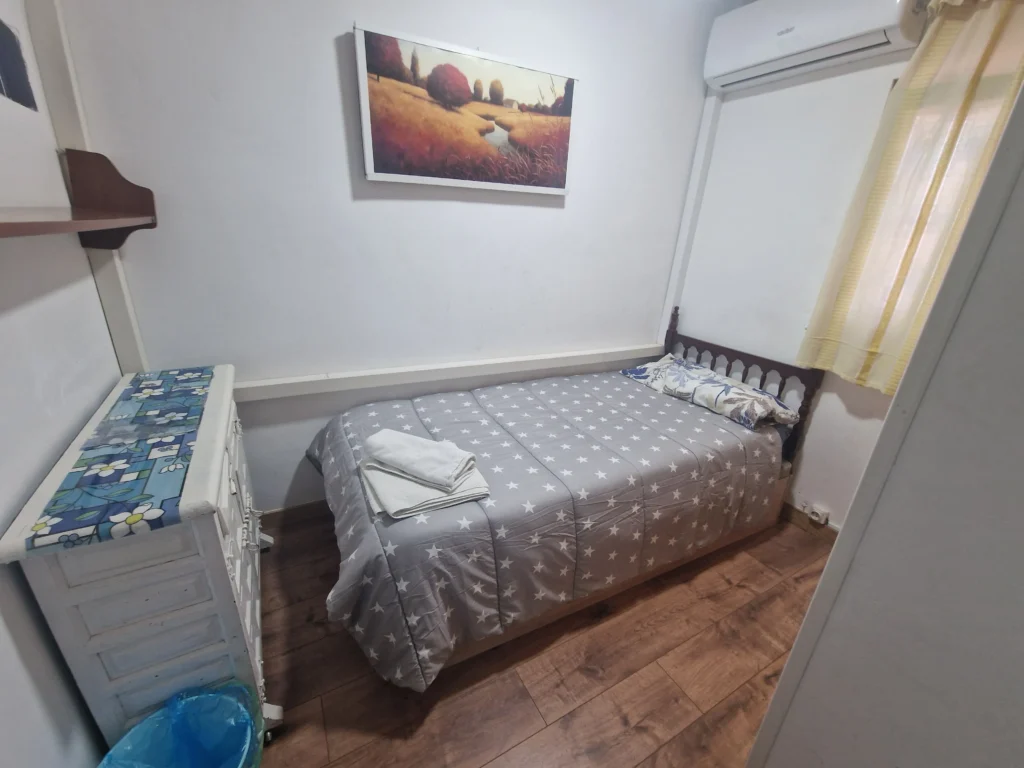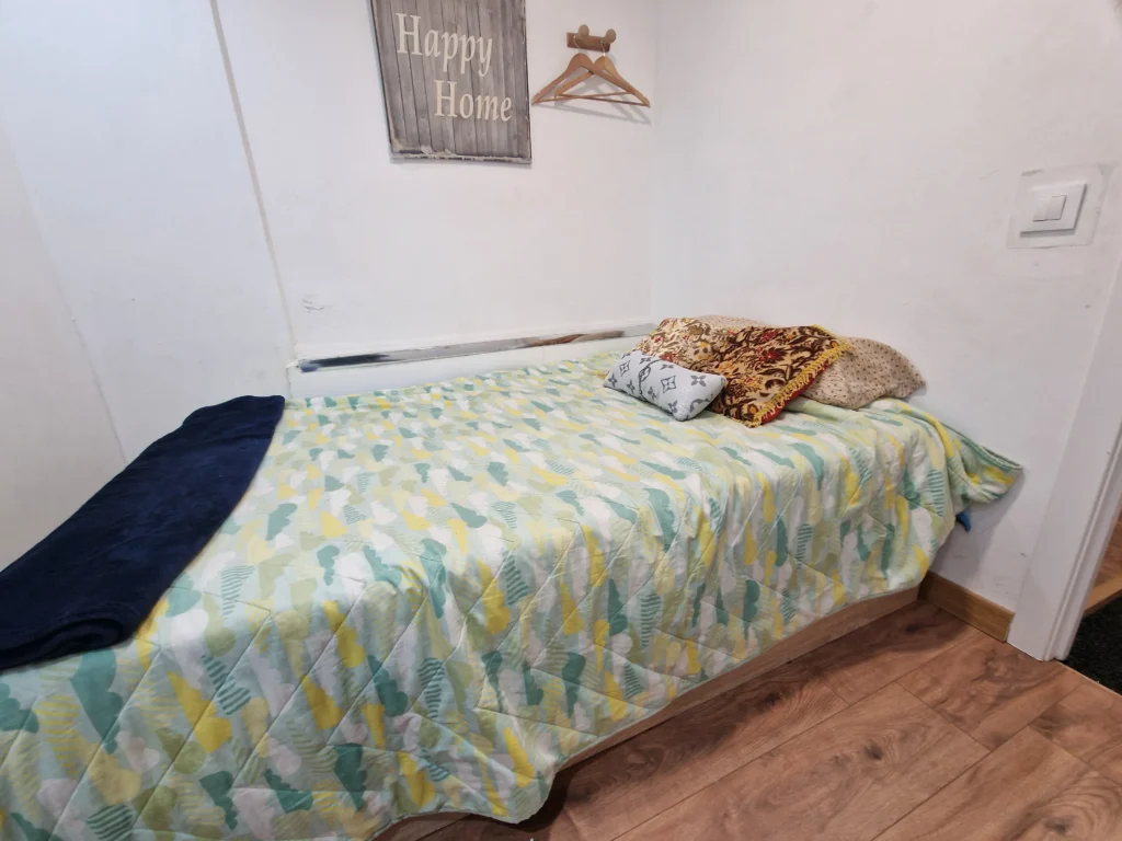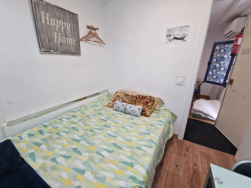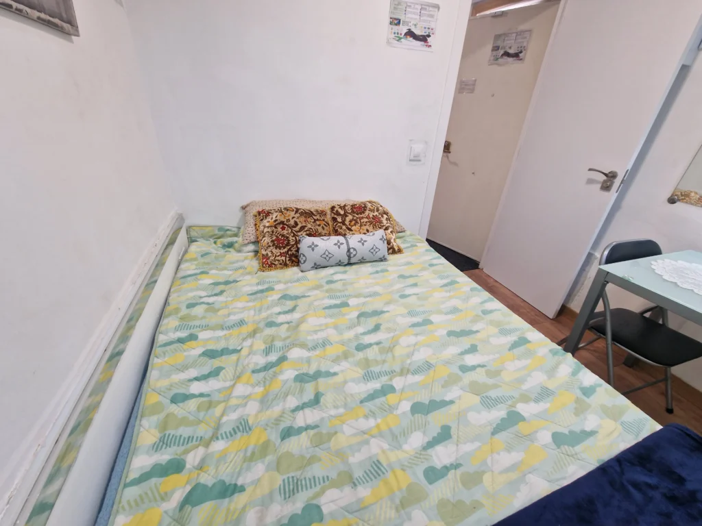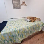 Dispondrás de un armario de madera para organizar tus pertenencias, así como una mesita de noche con lámpara, ideal para leer antes de dormir. Suelos de madera y una decoración sencilla crean un ambiente cálido y tranquilo. Es la opción perfecta si buscas un espacio privado, práctico y a un precio excelente.